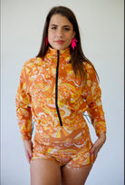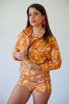 Our Blue Dream windbreaker is made for fashion and function. Printed in LA, this cropped windbreaker has adjustable sides and a full zip up front. 100% Drysense polyester.