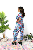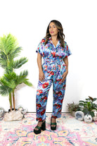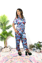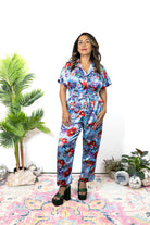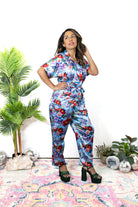 Our jumpsuit is for the bright and bold in all over print with our custom pen pocket on chest. Button up from cinched elastic waist, this jumpsuit is cut right at ankle for an easy one piece statement piece.