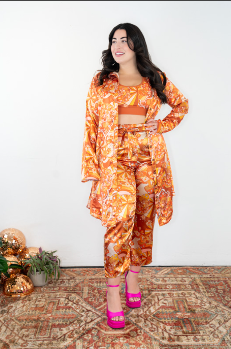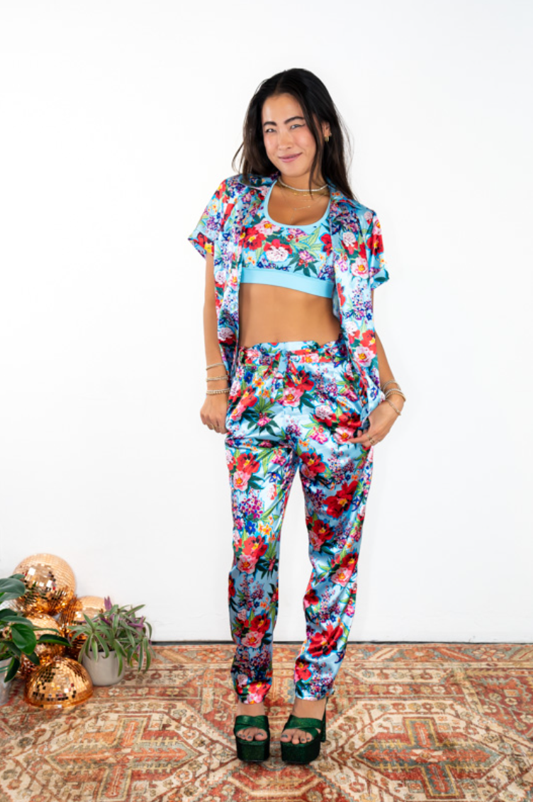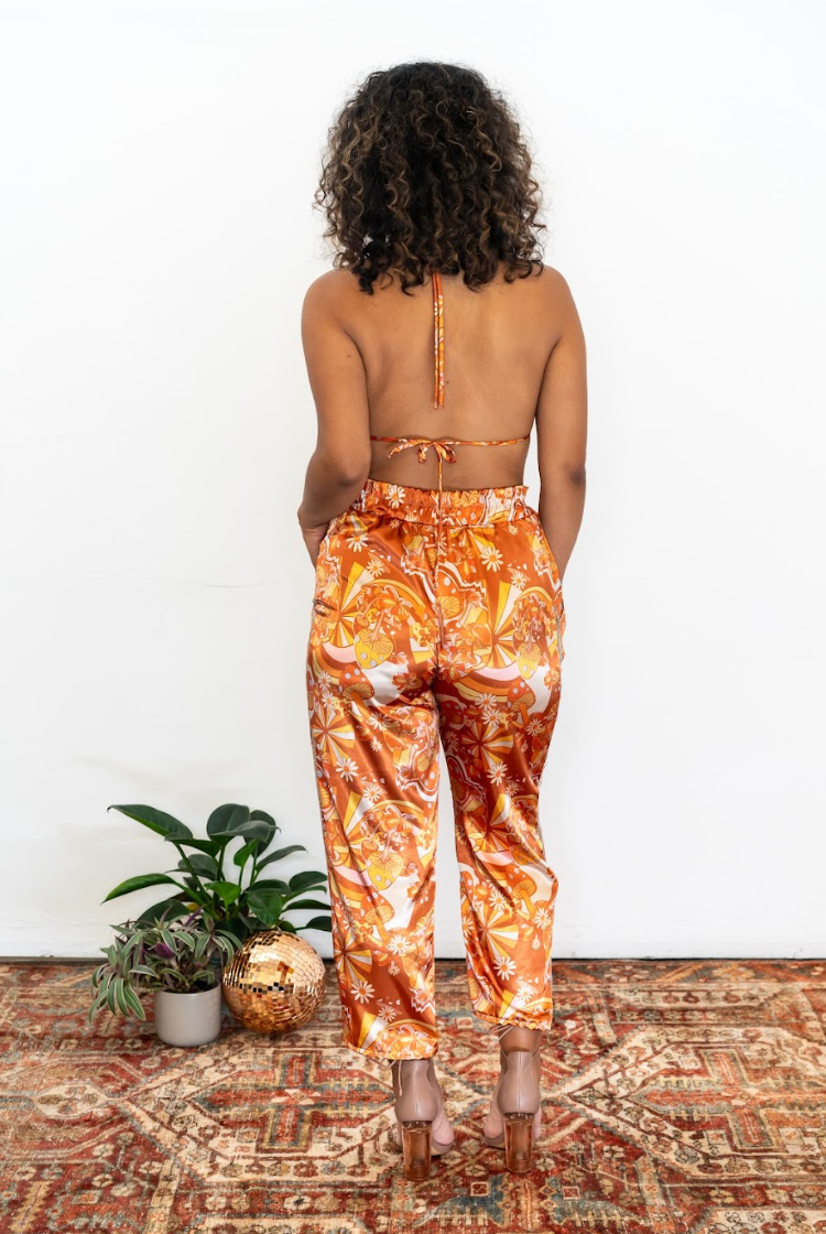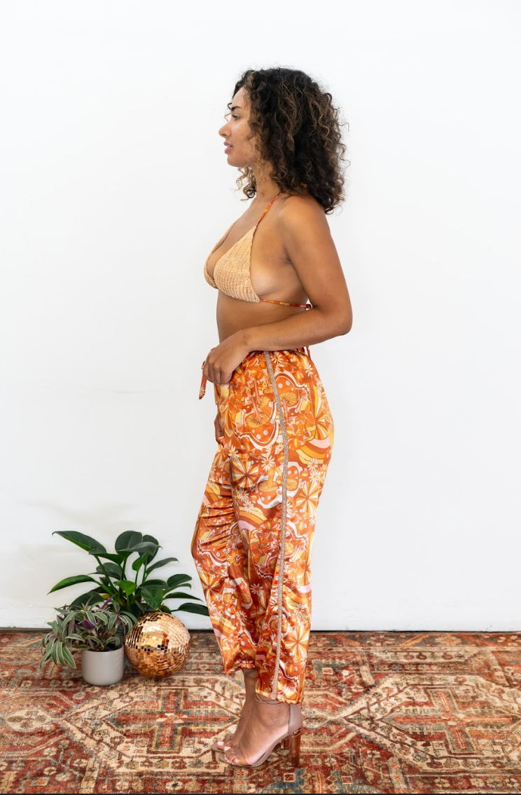 Lounge in luxury or dance the night away in our leisure pant that take you from day to night. Elastic waist, bold prints and a sparkle tuxedo accent on both sides of pants. Perfect for the farmers market or a night out on the town!
