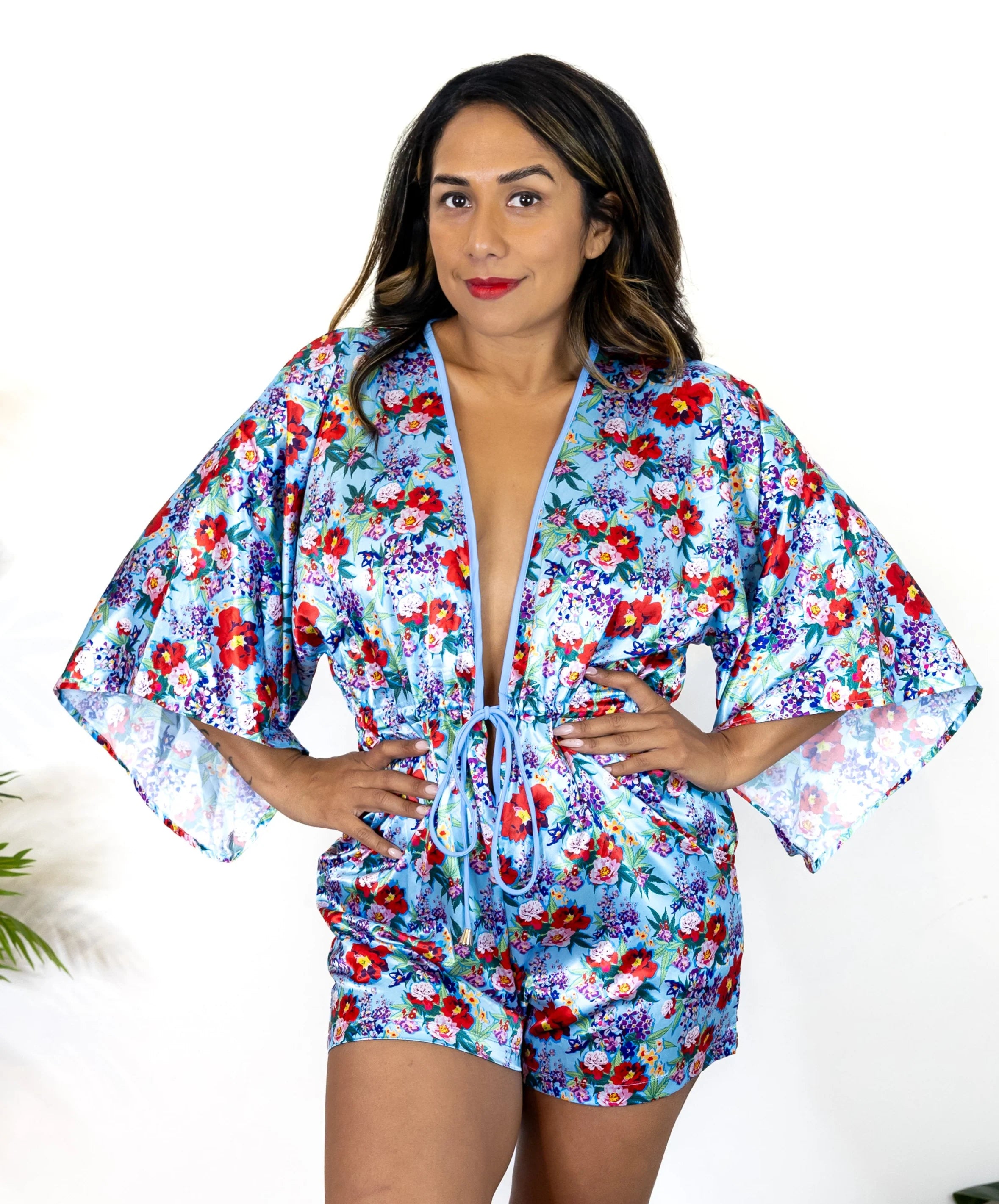 Nothing is dreamier than our soft, luxurious romper with butterfly sleeves and deep v for a sexy night out..or in. Available in a variety. of sizes and colors!