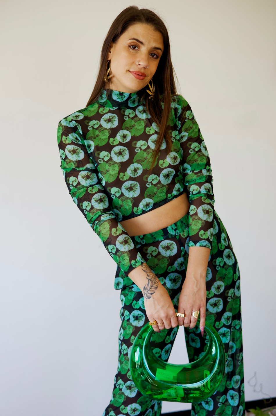 Featuring delicate mesh fabric, our crop top is sure to evoke a sense of wanderlust and whimsy wherever you go. Cropped mesh mock neck long sleeve top. Made in the USA